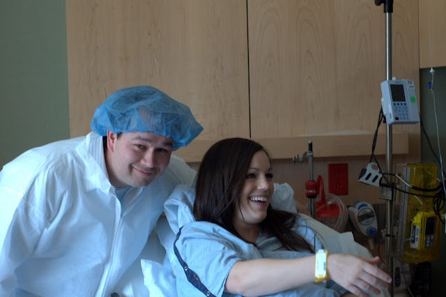 When I lay on my side to get the spinal block my head began to pound and my mom said that the veins in my forehead were popping out. I barely even felt a little sting, it didn't bother me nearly as much as my throbbing head. They layed me onto my back which made my head feel worse, I felt like it was going to explode. The anesthesiologist kept saying just a minute more and my headache should go away. I felt pressure and lightheadedness and it didn't seem to be normal. They kept saying "people have different reactions to spinals...", but I knew it wasn't that because it started before they ever poked me, as soon as I laid down. No one knew why I was feeling it and it scared me, I began to wonder if I had some clot or abnormal complication, what if I died while they got my babies out? I was so scared. Brad didn't know any different and it all seemed perfectly normal to him, he told me later he wasn't nervous at all. Easy to say when you're the hand-holder I guess {ignorance is bliss!}